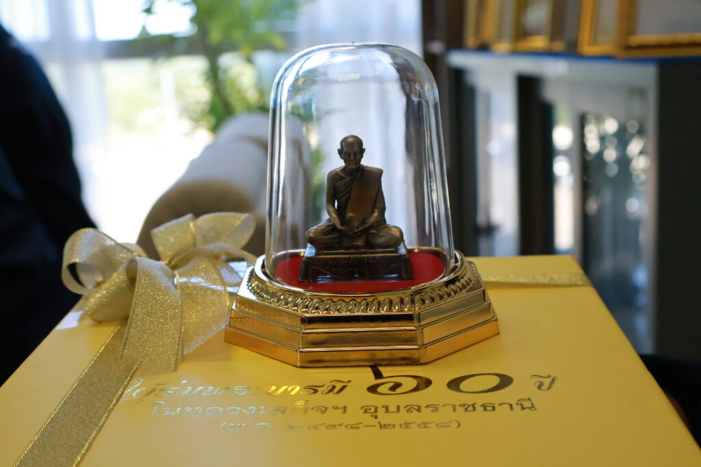 ทั้งนี้นายรัฐธนินท์ เตชะไชยสิทธิ์ ประธานกรรมการหอการค้าจังหวัดอุบลราชธานี ได้มอบหนังสือ “ใต้ร่มพระบารมี ๖๐ ปี ในหลวงเสด็จฯ อุบลราชธานี (พ.ศ.๒๔๙๘-๒๕๕๘)” และรูปเหมือนหลวงปู่มั่น ภูริทัตโต ซึ่งเป็นที่ระลึกและเป็นเครื่องยึดเหนี่ยวจิตใจ